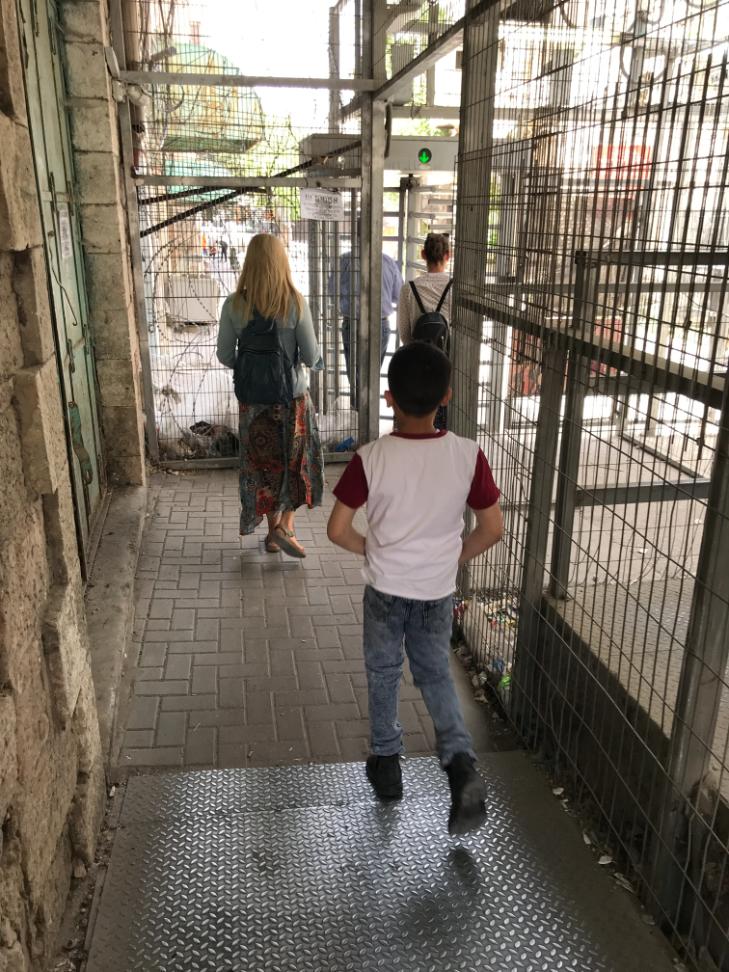 We come to another checkpoint and while our passports are being inspected, three Palestinian boys, all approximately 10-years of age, approach from a house on one side of the fence hoping to cross to the other, most likely to visit relatives for the Eid holiday. Like us, they must show valid identification, but even despite their young age and cautious demeanor, the soldier actually trains the barrel of his rifle on the group, his finger literally on the trigger, while he awaits talk-back from his shoulder-mounted radio, and then briskly gives them a nod to move along. Minutes later, we catch up with them where we all wait to pass through industrial turnstiles that will return us to Palestinian streets.